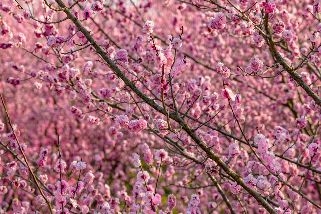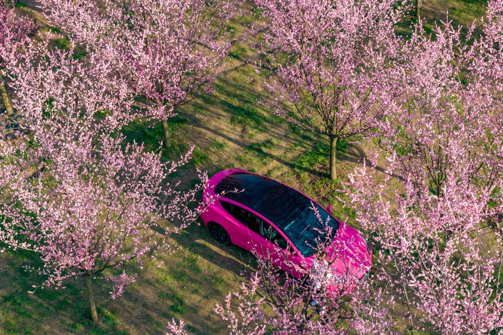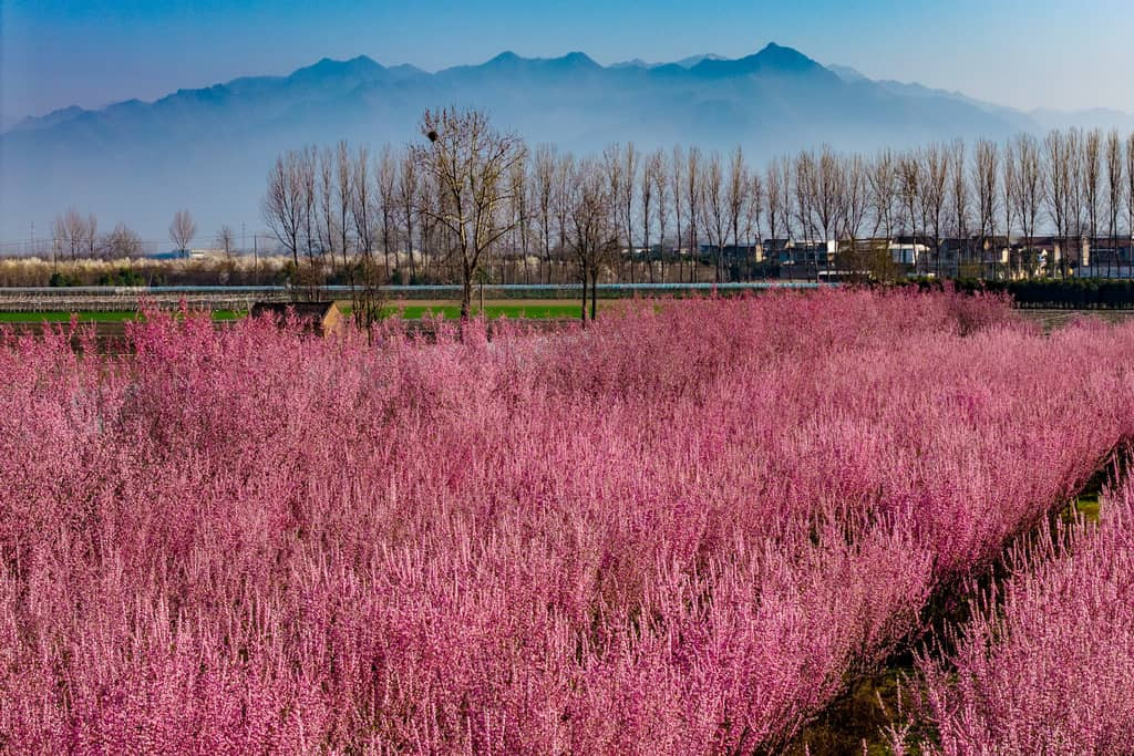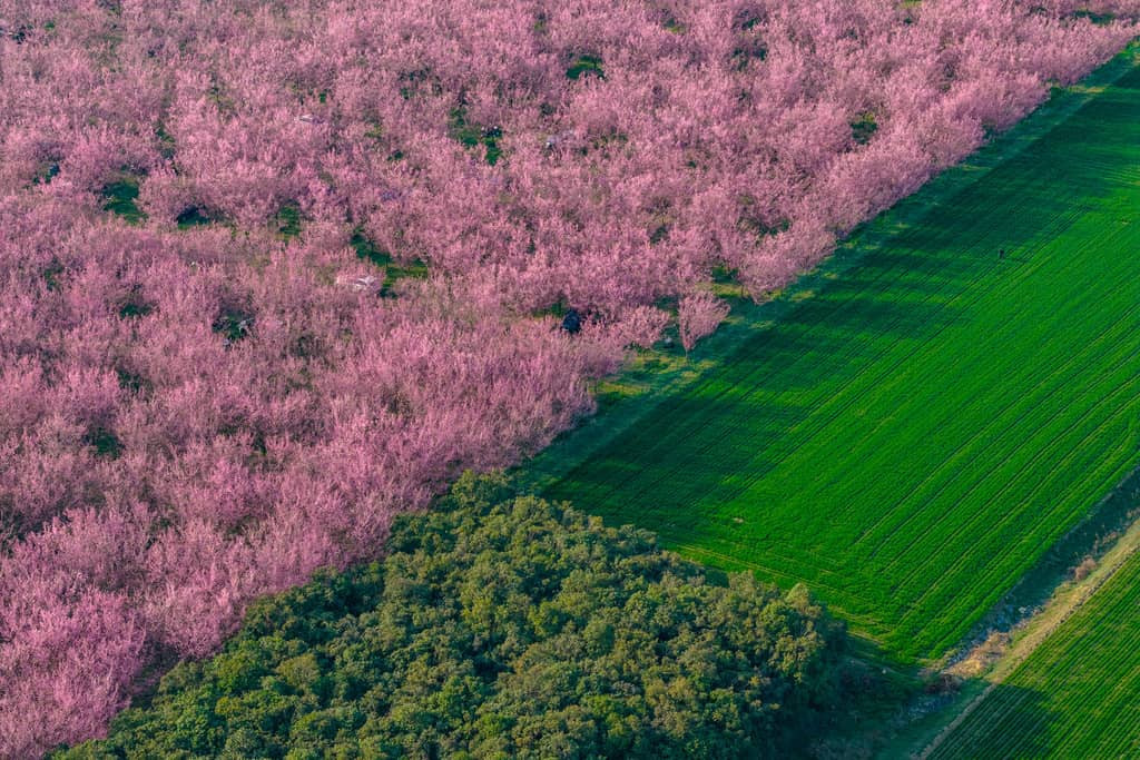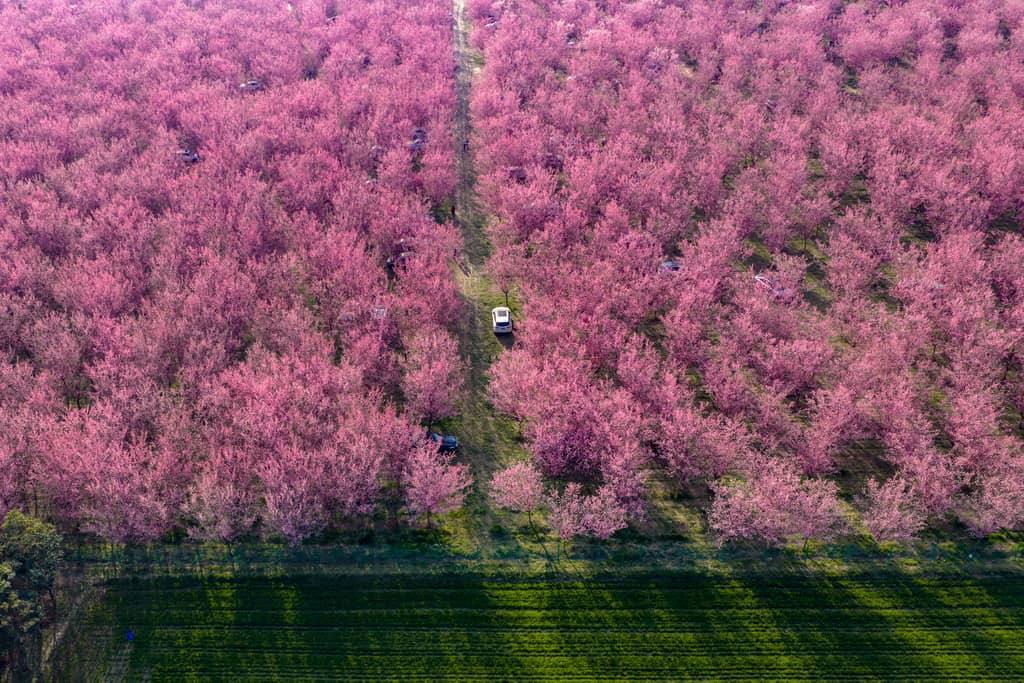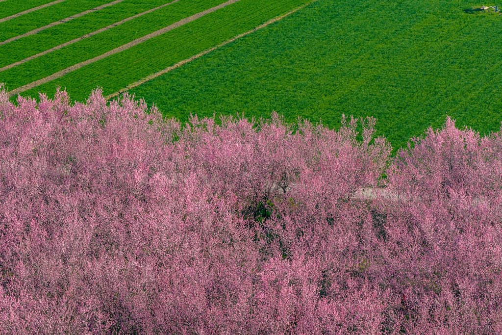 春日时节,陕西省西安市鄠邑区甘河街道丁村梅园的大片粉红色梅花进入盛花期,与翠绿的麦田、村庄和远处的秦岭山脉构成一幅春日画卷,吸引游客前来观赏。