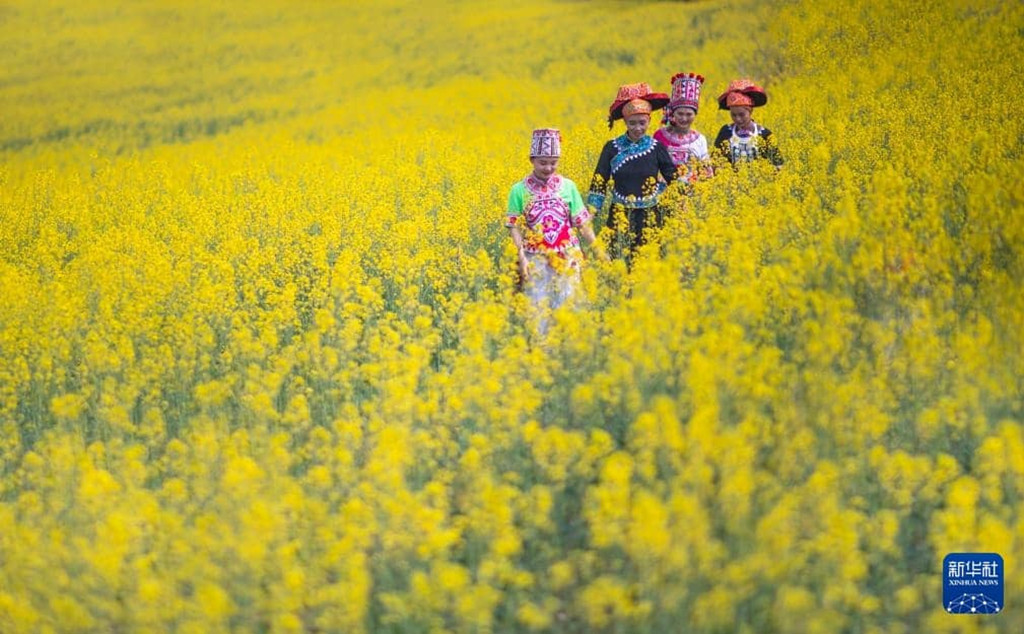 人们在云南省文山壮族苗族自治州砚山县阿猛镇下科木村油菜花田游玩 新华社发(熊平祥 摄)