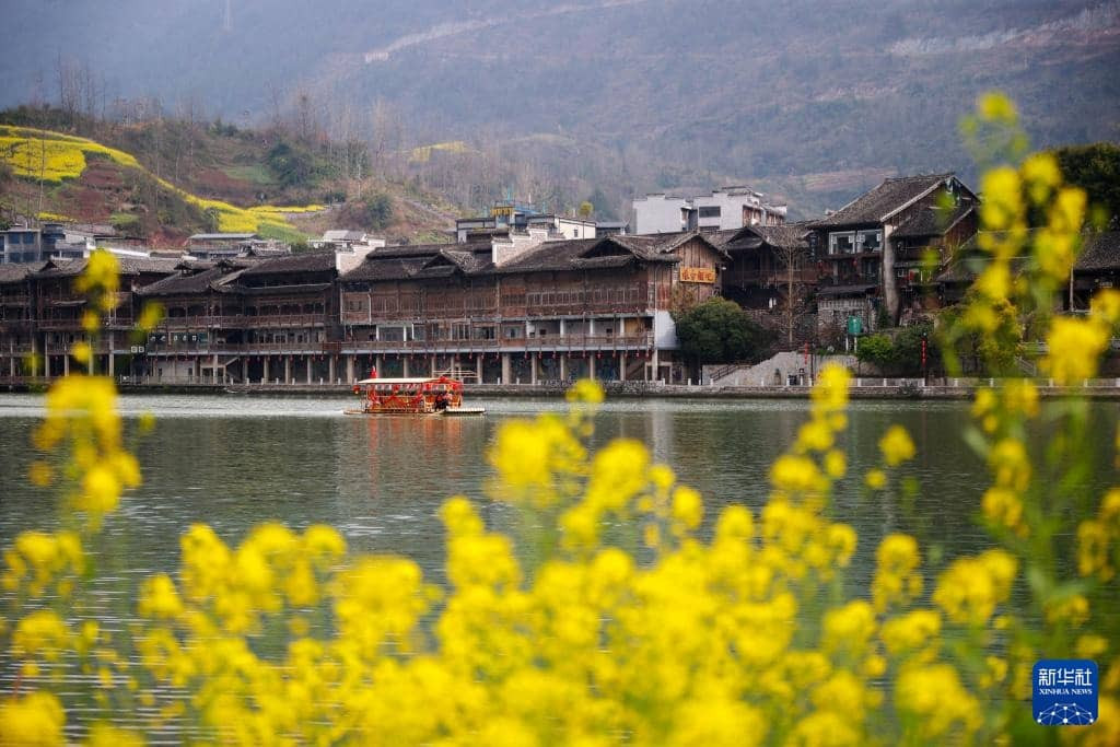 游客在重庆市黔江区濯水古镇乘坐电动竹筏游览阿蓬江 新华社发(杨敏 摄)