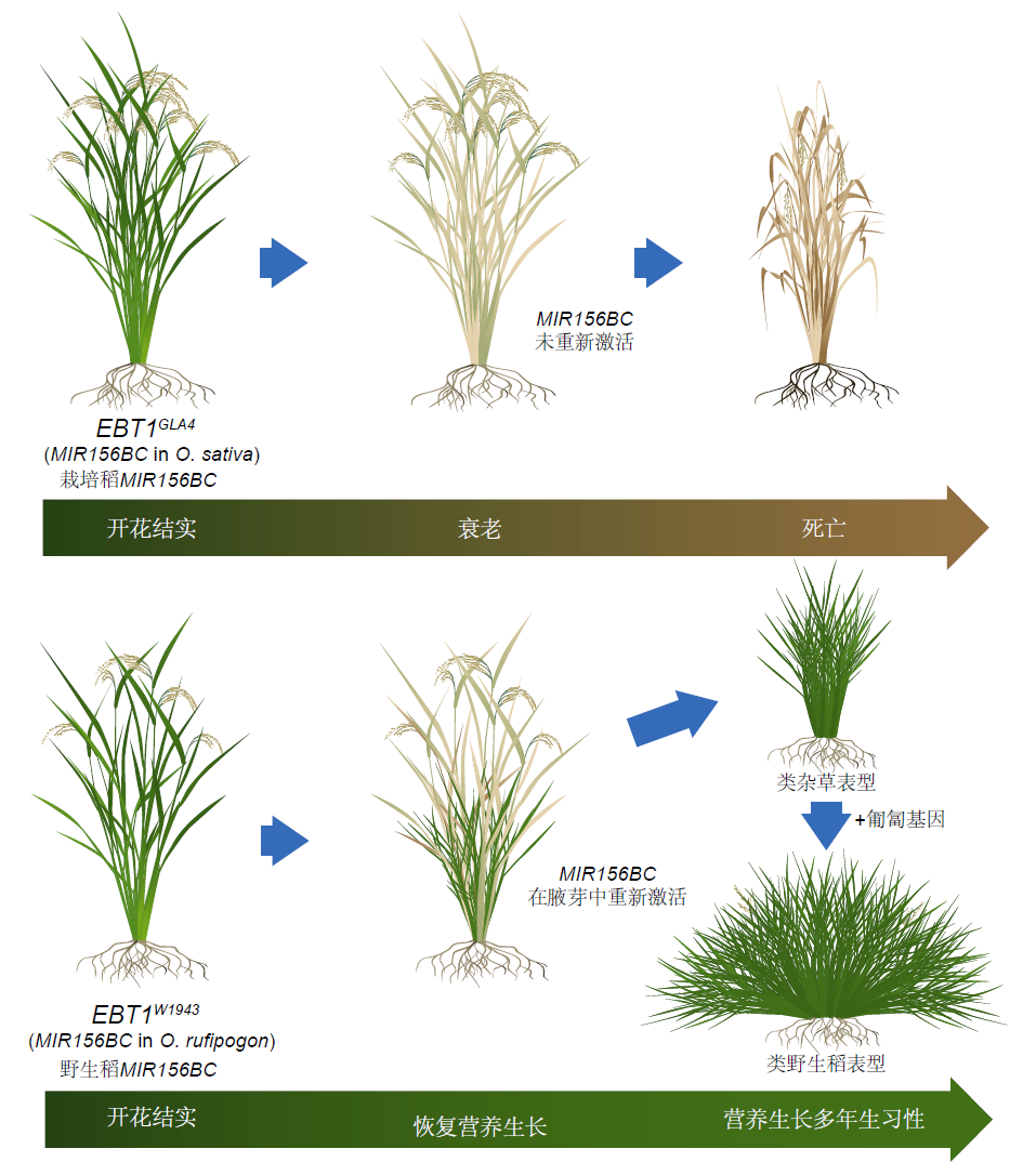 令人意外的是,野生稻的MIR156B和MIR156C基因,在遵循“随年龄递减”表达模式的同时,会在开花后分蘖节的腋芽中重新被激活。“这种表达状态的‘重置’,让腋芽重新获得营养生长能力,不断萌发新分蘖,从而实现多年生生长。”王佳伟解释,这一独特的重启现象,与野生稻EBT1基因座位的表观修饰状态密切相关。