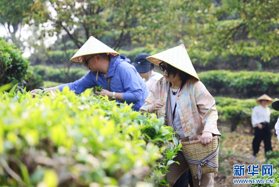 游客体验采茶(资料图)。新华网发