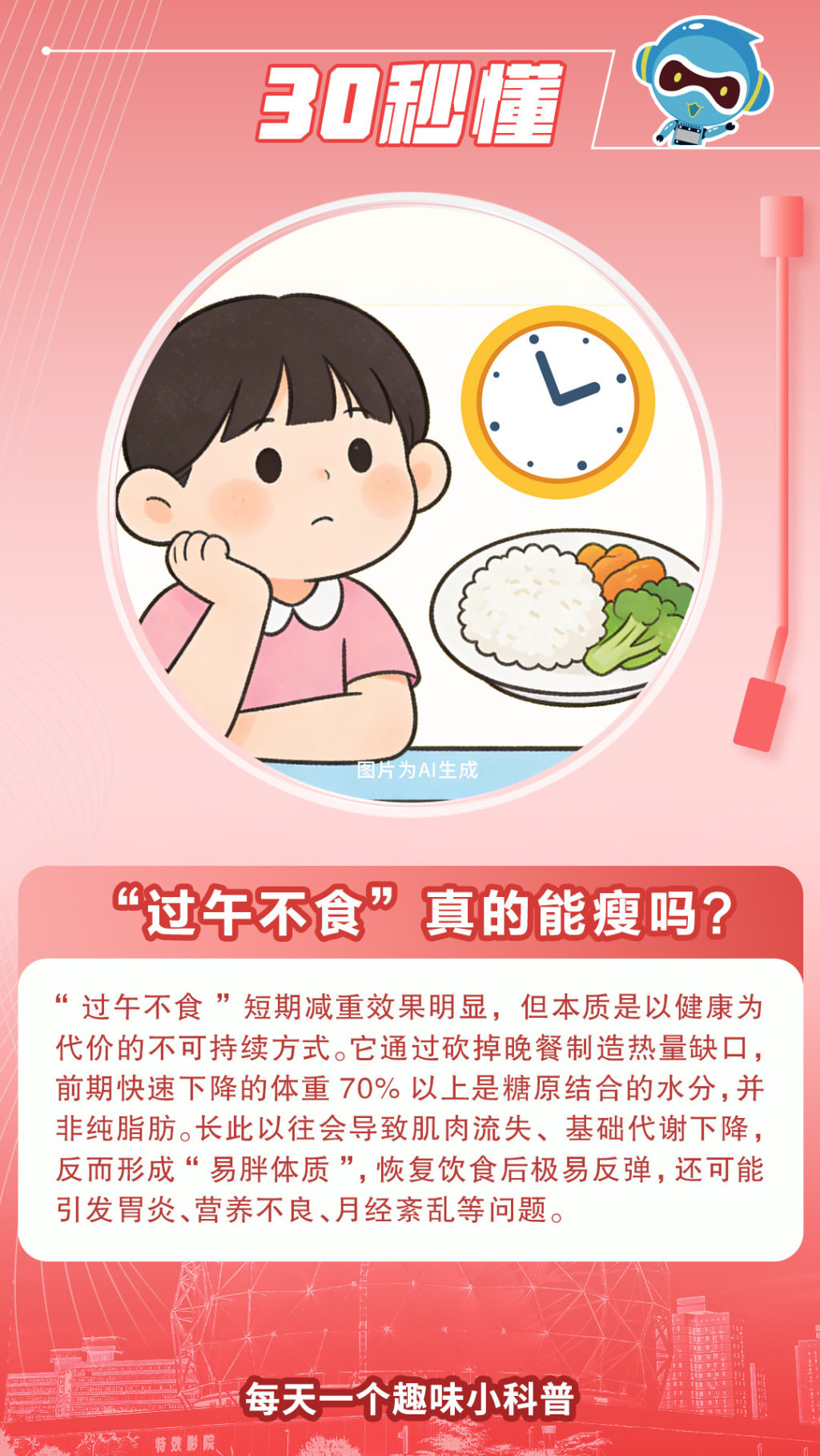 “过午不食”短期减重效果明显,但本质是以健康为代价的不可持续方式。它通过砍掉晚餐制造热量缺口,前期快速下降的体重70%以上是糖原结合的水分,并非纯脂肪。长此以往会导致肌肉流失、基础代谢下降,反而形成“易胖体质”,恢复饮食后极易反弹,还可能引发胃炎、营养不良、月经紊乱等问题。
