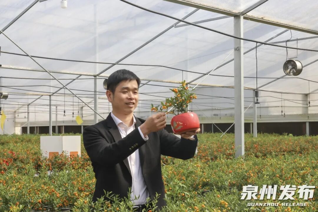 在永春岵山福建海峡花卉产业园,年轻博主通过直播推介永春金豆盆栽,平均一天可通过线上售出2000盆。(郑银杰 摄)