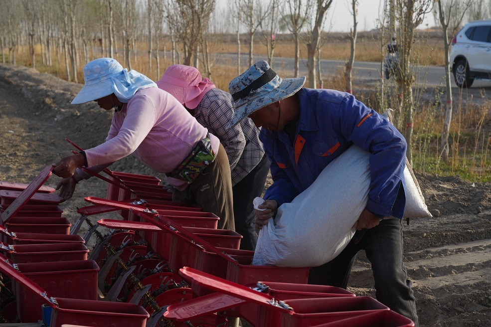 本次播种采用“水稻旱直播技术”,省去传统育秧、移栽环节,既适配当地缺水的生态环境,实现节水省工,又大幅提升播种效率——单台播种机每日可完成300余亩播种任务,出苗率达95%以上,让沙漠农业跑出“加速度”。播种现场,经过处理的羊脂籽米稻种被整齐装入播种机,农机手熟练操作设备,高效精准完成播种。