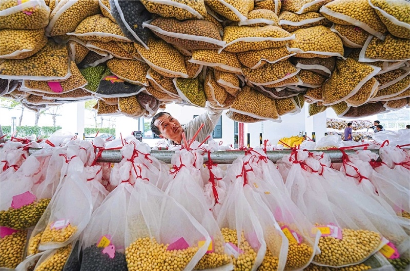 2024年2月28日,三亚市崖州湾科技城南繁服务站,工作人员对大豆品种进行分类打包。王程龙 摄