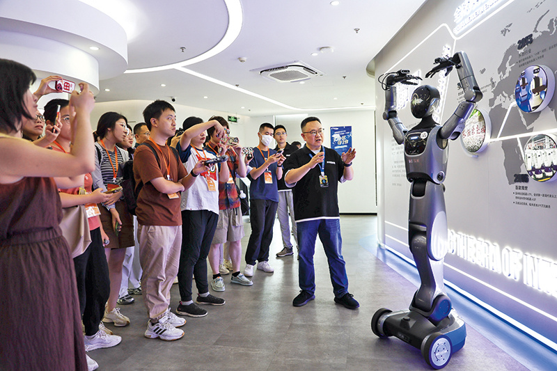 上海在吸引外商投资、优化营商环境、护航企业出海、提供金融支持等方 面持续加大改革力度和广度。图为上海擎朗智能科技有限公司的人形机器人表 演(2025 年 9 月 12 日摄) 王翔摄 / 本刊