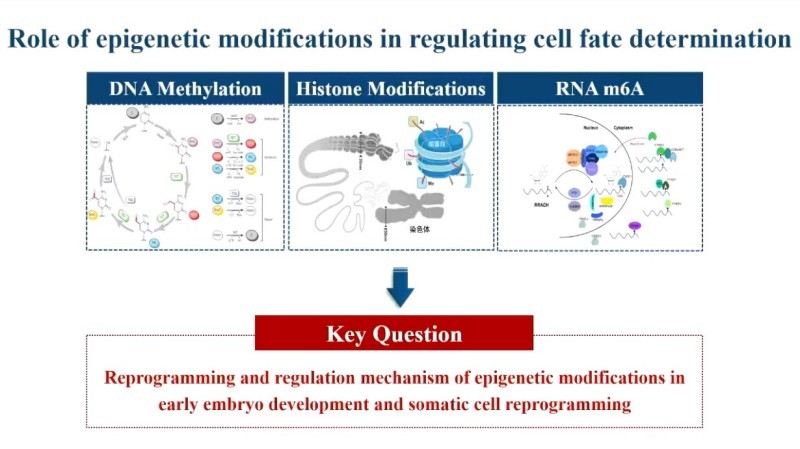 什么是“表观遗传”?如果把细胞里的DNA比作一本固定的“遗传剧本”,那“表观遗传”就是给剧本贴的各种“小标签”:有的标签会让某个基因“上台表演”,也就是激活它表达;有的标签会让基因“安静待着”,也就是抑制它表达。这些标签不改变DNA本身,却能决定细胞的“命运”——它会变成什么样子、怎么发育。高绍荣团队主要对两种“标签”进行研究:一种是给包裹DNA的“组蛋白”加修饰,另一种是给RNA加修饰,就是这两种修饰在悄悄指挥细胞和胚胎的生长。