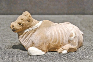 新疆出土的唐代泥塑牛俑反映了当时“鞭春牛”习俗中的泥牛形象。