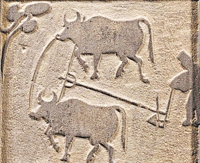 汉代画像石中的“耦犁”牛耕,是当时先进的农耕方式。
