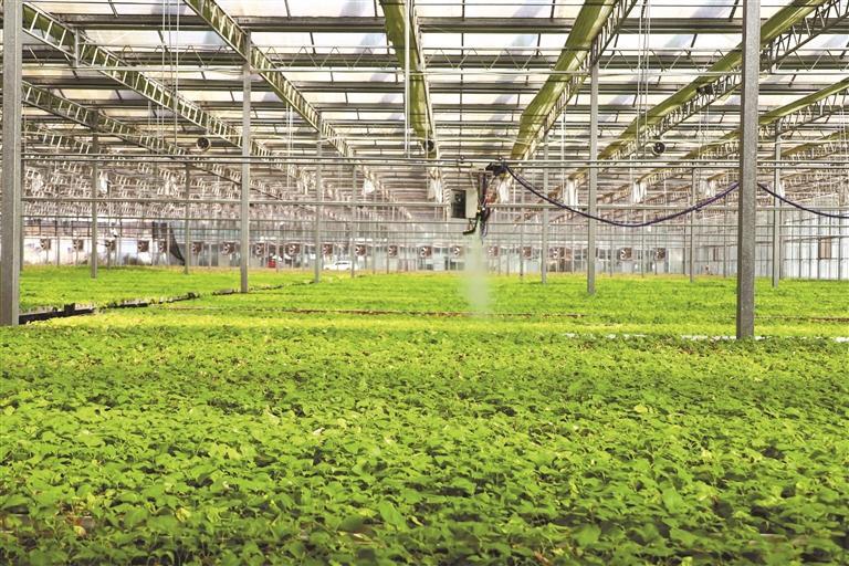 中垦薯业智能温室大棚内,自动化喷水机为马铃薯原原种浇水。罗喜贵 摄 影像贵州