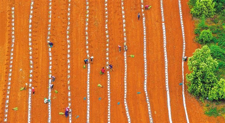 4月8日,江西樟树市义成镇淖港村,村民在田间栽种黄栀子苗和套种西瓜苗。当地大力发展中药材种植产业,推广“农业套种、生态循环”模式,扩大种植规模,提升农业效益。周亮 摄(中经视觉)