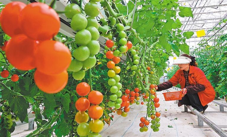 2月27日,江苏连云港市海州区浦南镇番茄庄园,工作人员在采摘小番茄。该基地利用无土栽培技术种植番茄,病虫害少、产量高、生产持续时间长。耿玉和 摄(中经视觉)