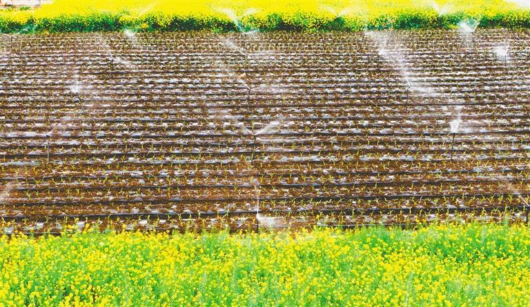 3月20日,位于四川德阳市旌阳区的黄土河农业专业合作社,节水喷灌设备正在对栽种的牛奶水果玉米苗进行喷灌作业。唐渝川 摄(中经视觉)