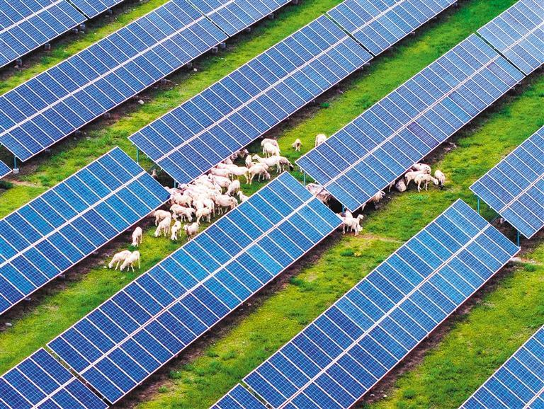 2025年8月4日,陕西榆林市砖井镇,羊群在光伏产业园里吃草。“板上发电、板下牧羊”让清洁能源、生态保护与畜牧养殖协同发展。周修建 摄(中经视觉)