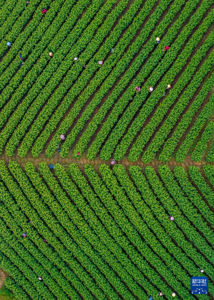 采茶工在浙江省余姚市兰江街道茶园采摘茶叶(无人机照片)。新华社发(张辉 摄)