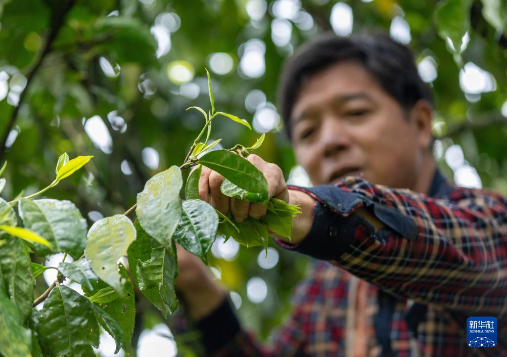 重庆市南川区德隆镇茶树村,茶农在古茶树上细心挑选优质茶芽。新华社发(罗川 摄)