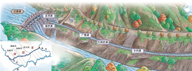 郑国渠与“关中八惠”示意图。图片由石子儿绘,童趣出版有限公司授权使用,选自图书《伟大的中国智慧:世界灌溉工程遗产》。