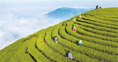 茶农在四川泸州市纳溪区护国镇德红村红岩子茶园采摘茶叶。四川泸州职业技术学院电气与电子工程学院印度籍教师 夏玛 摄