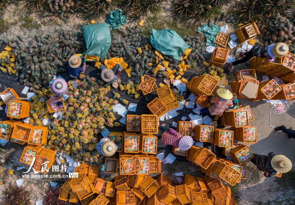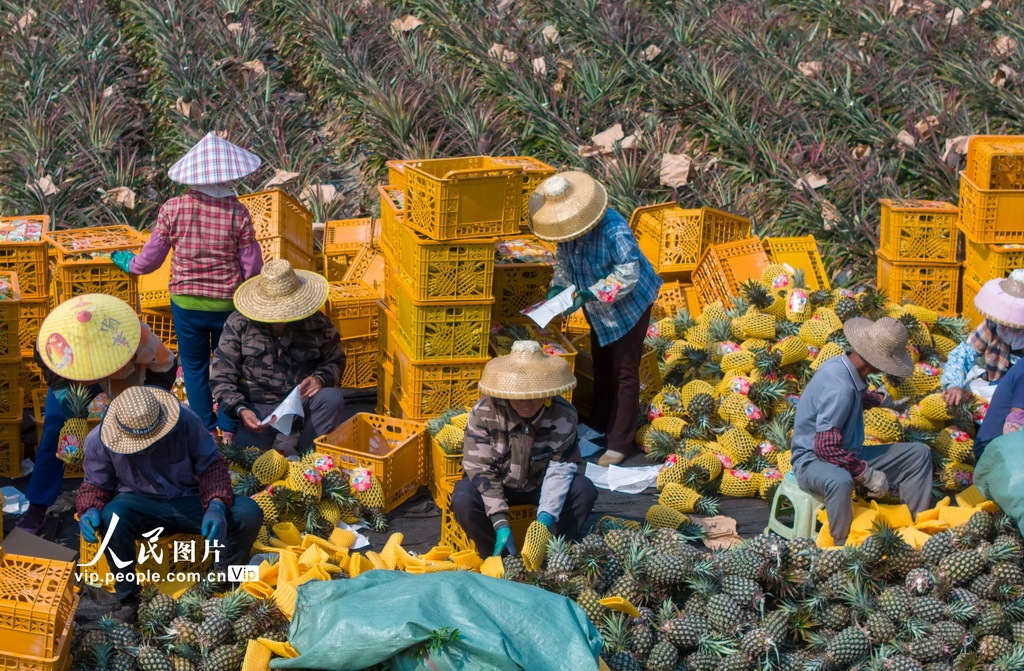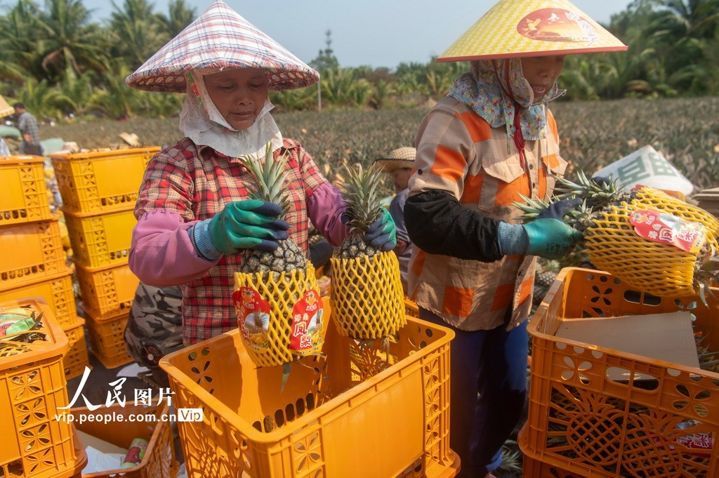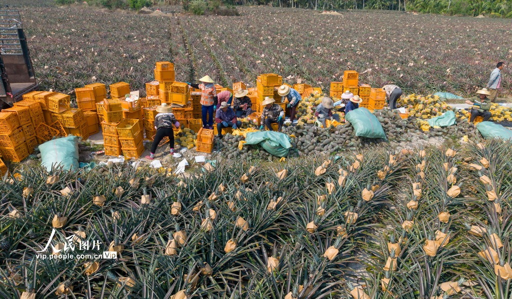 2026年4月13日,海南省琼海市潭门镇农民正头顶烈日,加紧在坡地里采收凤梨。今年琼海凤梨种植面积超2.5万亩,预计产量超7万吨。在持续高温作用下,不少凤梨加快成熟。潭门镇农民抢抓农时加紧采收,运销各地。蒙钟德 摄