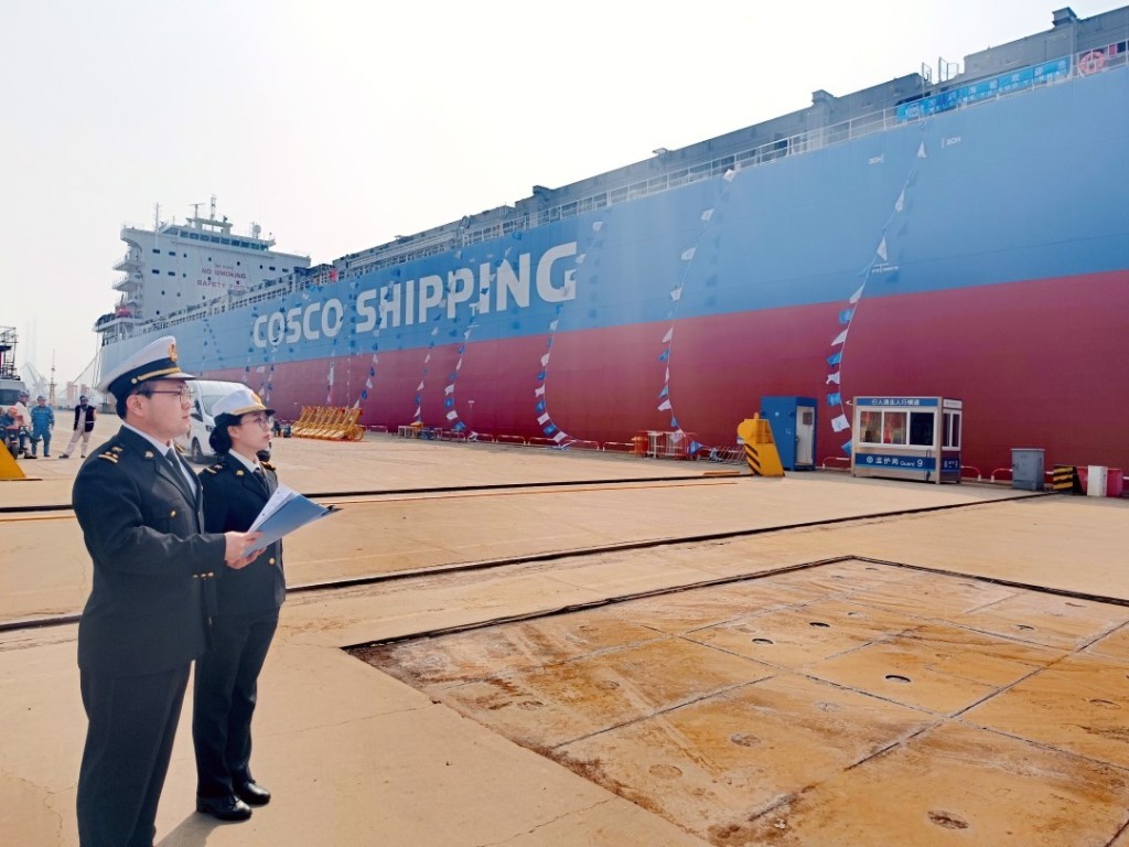 近日,在大连中远海运重工有限公司修造船码头,大连海关所属大连港湾海关关员对全国首制8万吨多用途粮食运输船“国韵海”轮进行异地登临监管。随后,该轮顺利交付出口,将服务于中国至南美航线。