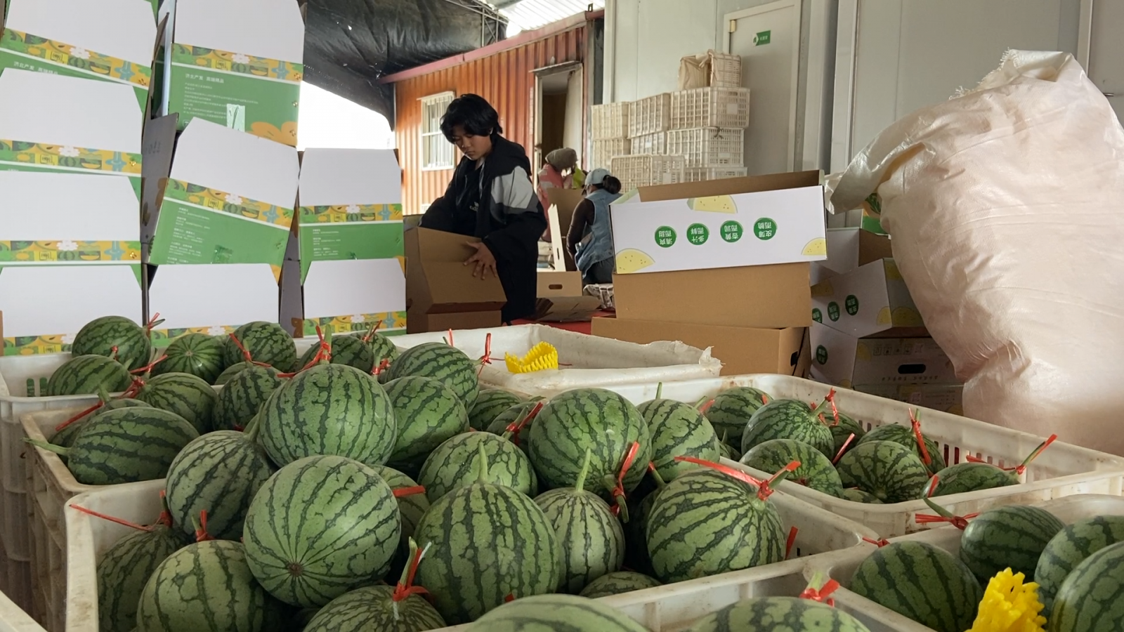 仁风西瓜丰收,工人在装箱。