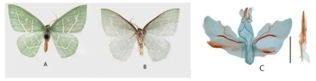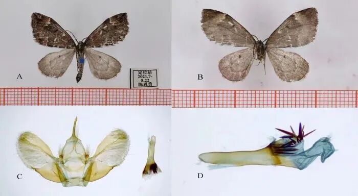 图为色季拉奇带尺蛾模式标本成虫和外生殖器。