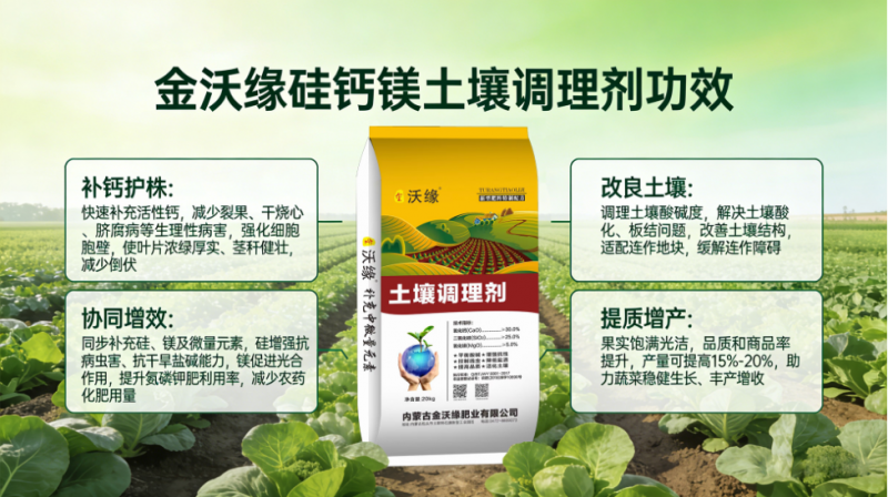 硅钙镁土壤调理剂:改良土壤,筑牢生长根基针对当下土壤酸化、板结、盐渍化、中微量元素匮乏等问题,硅钙镁土壤调理剂可有 效调节土壤酸碱度,破除板结,疏松活化土壤,提升土壤透 气性与保水肥能力;同时补充钙、镁、硅等多种中微量元素,促 进作物根系发达、扎根更深,增强作物抗倒伏、抗病、抗涝能力,减少苗期烂根、死苗、黄叶等问题,为作物全生长期健康、生长打下坚实基础。