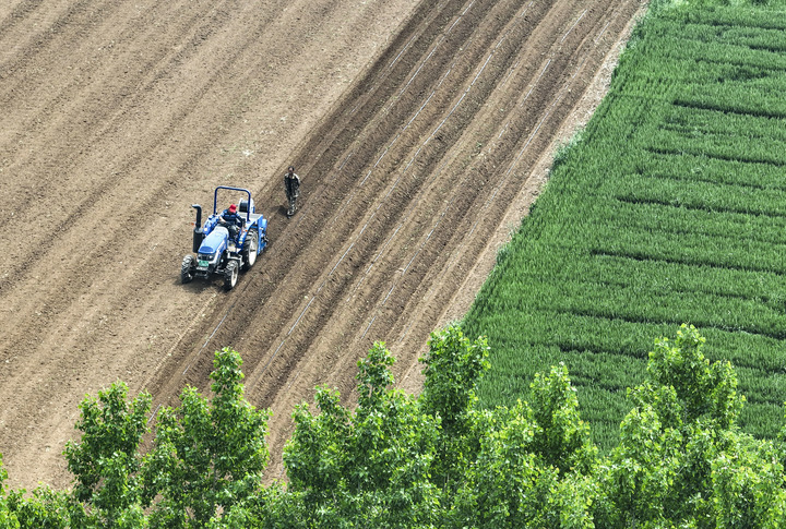 4月26日,河南省济源市克井镇农民驾驶农机在田间劳作(无人机照片)。新华社发(苗秋闹 摄)