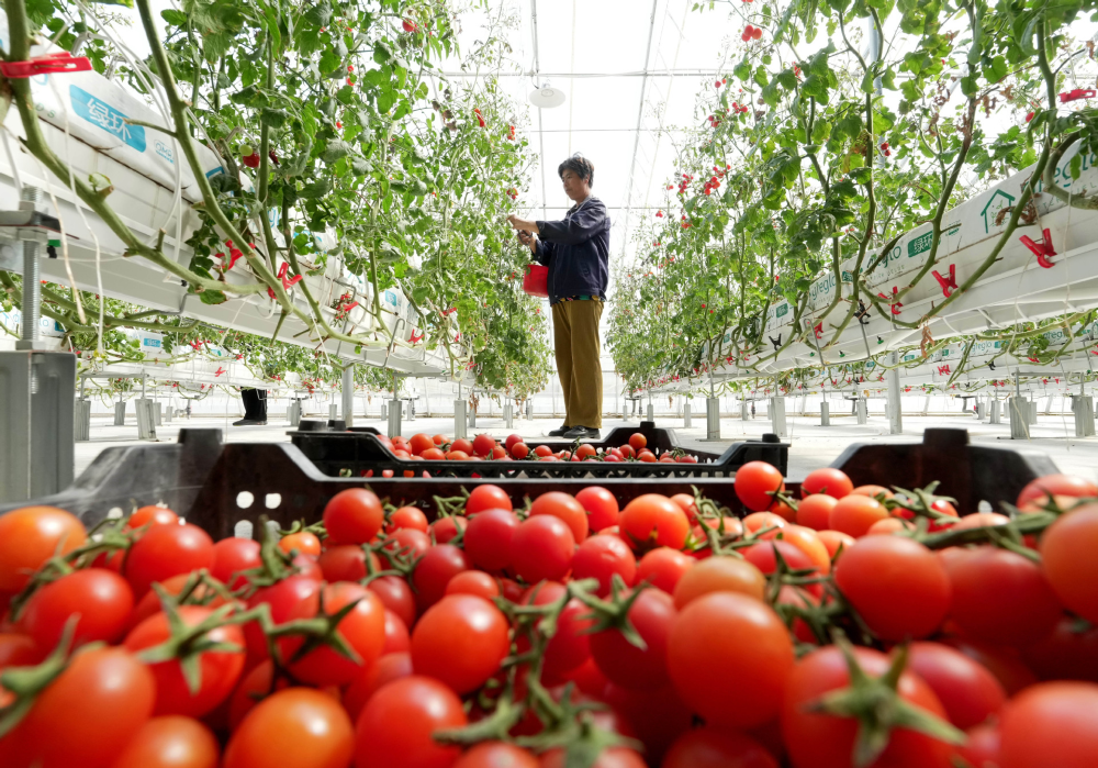 2026年4月27日,农民在河北省秦皇岛市卢龙县木井镇蔬菜种植基地的大棚内采摘西红柿。图片来源:新华社
