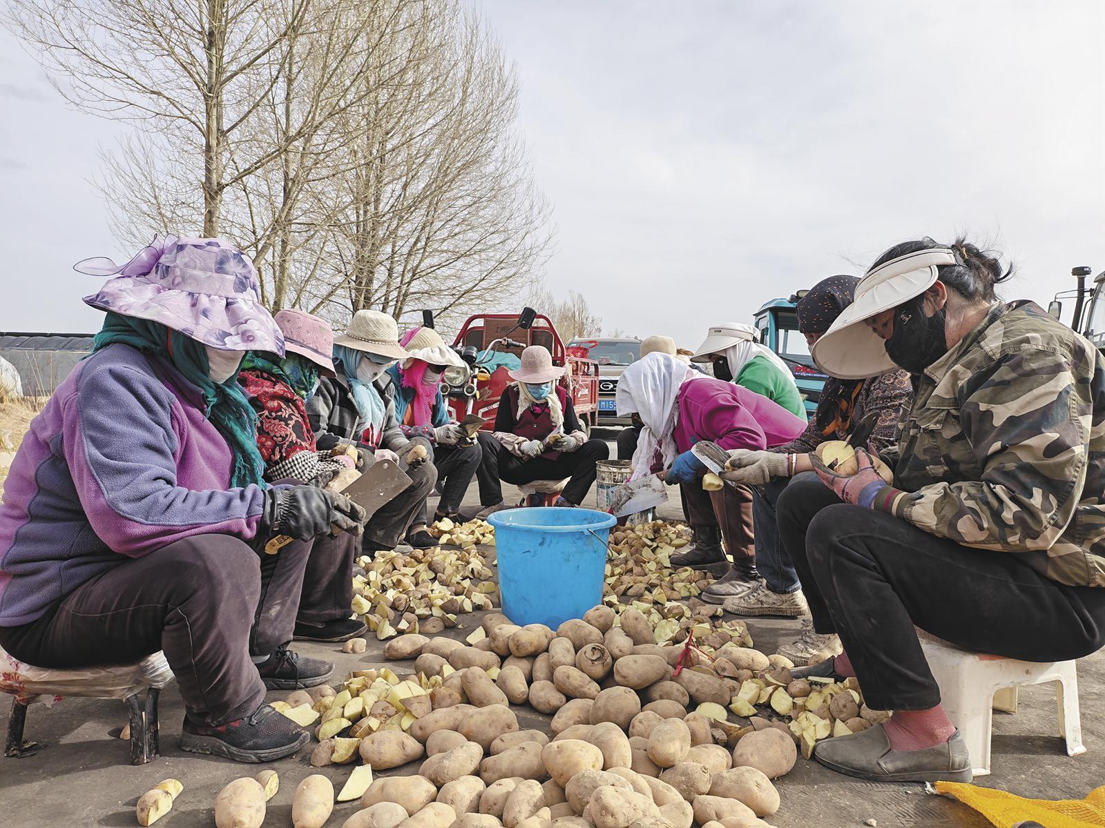 连日来,青海省海西蒙古族藏族自治州德令哈市河西街道白水河村田间,春日播种工作正有序进行。村民先将优质“青薯9号”原种切块,为后续机器播种打下基础。