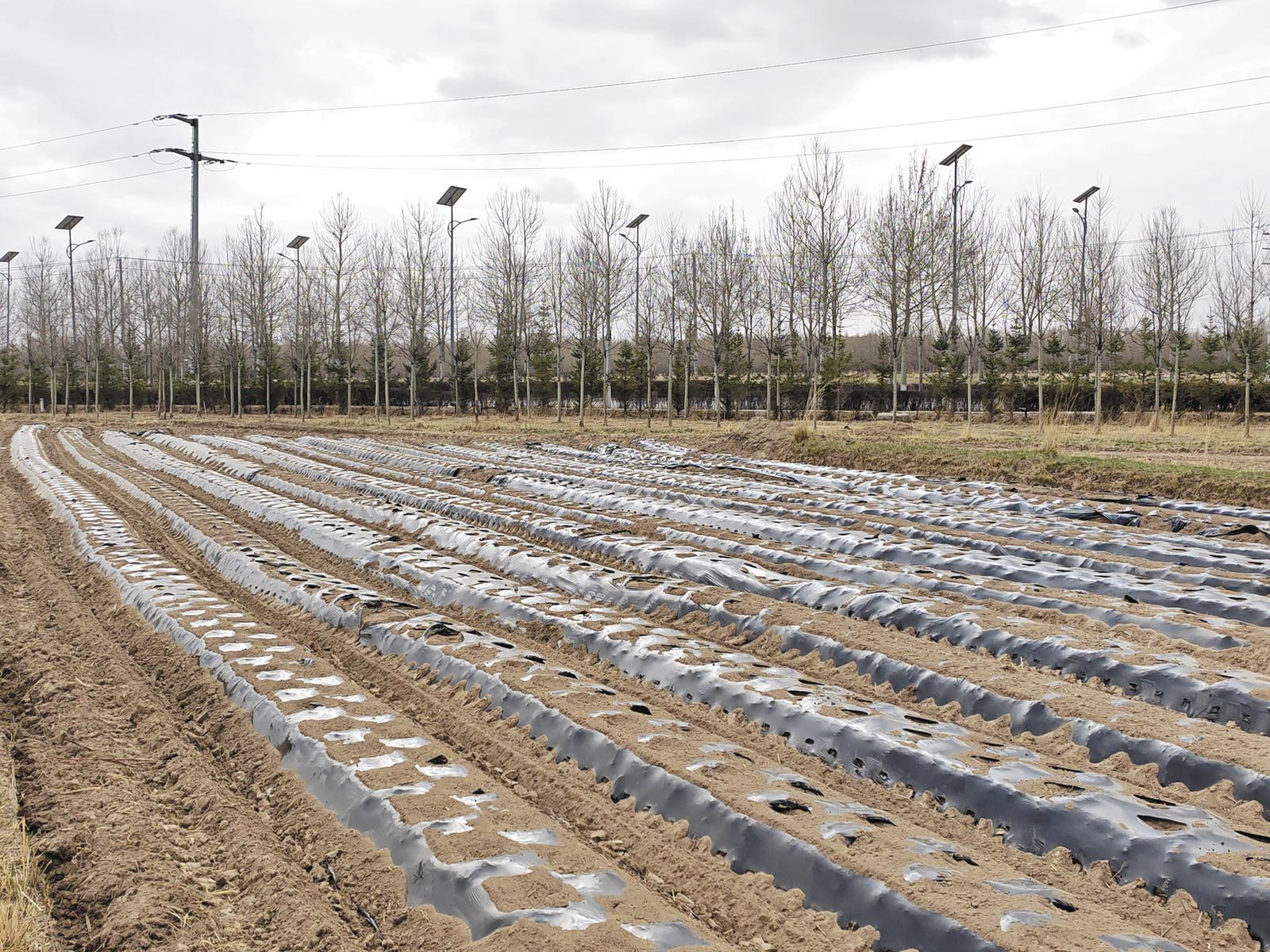 一切准备就绪后,马铃薯点播机驶入田间,播种、覆土、铺膜一气呵成,一行行黑色地膜整齐铺展在土地上。