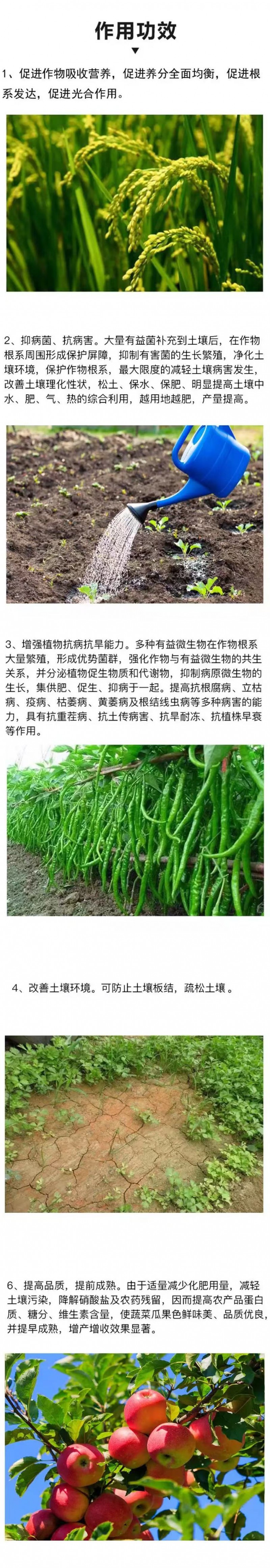 2、抑病菌、抗病害。大量有益菌补充到土壤后,在作物根系周围形成保护屏障,抑制有害菌的生长繁殖,净化土壤环境,保护作物根系,减轻土壤病害发生,改 善土壤理化性状,松土、保水、保肥、明显提高土壤中水、肥、气、热的综合利用,越用地越肥,产量提高。